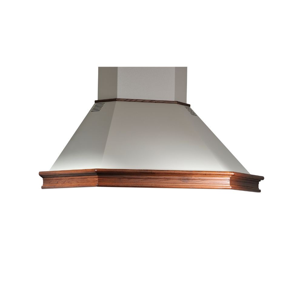 Cappa angolare in legno massello e panna bucciato per cucine rustico-classiche. Aspirante con comandi semplici e luci a LED, perfetta per...