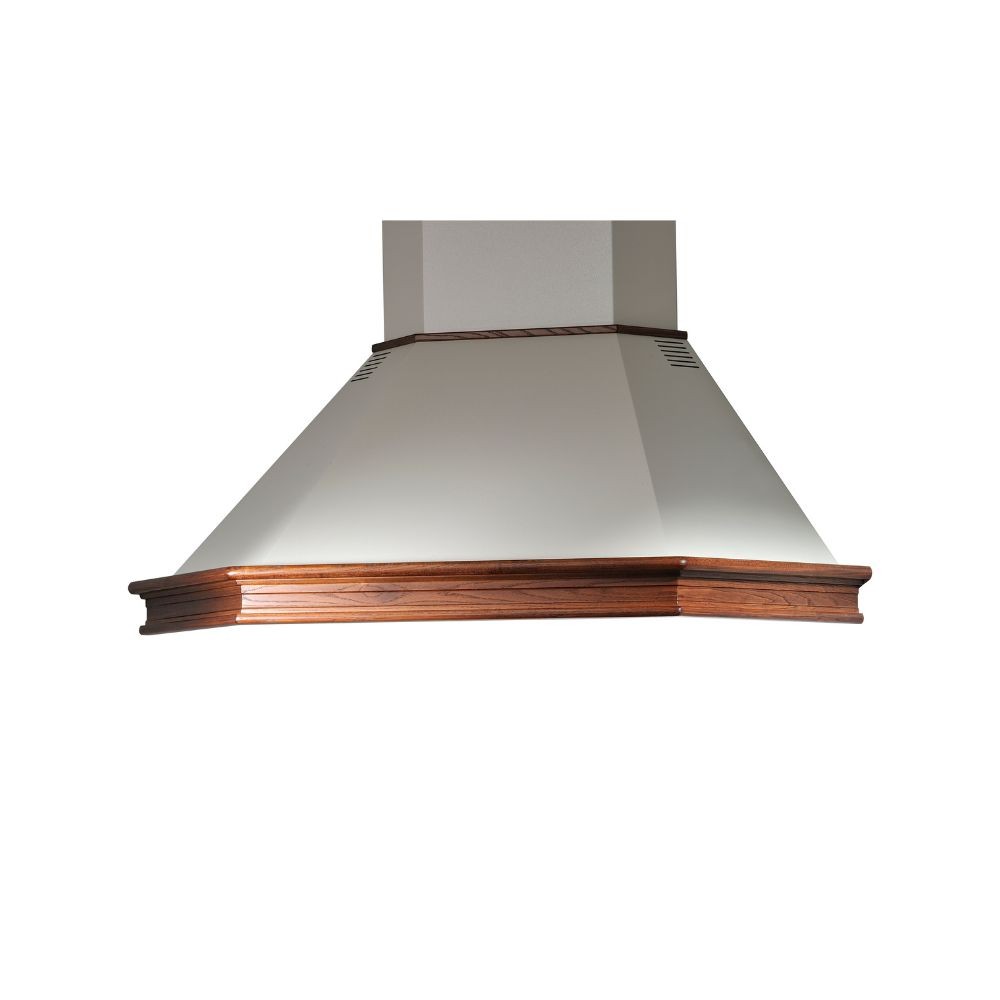 Cappa angolare rustica in legno massello e panna bucciato, aspirante con comandi intuitivi e luci LED. Perfetta per cucine in stile tradi...