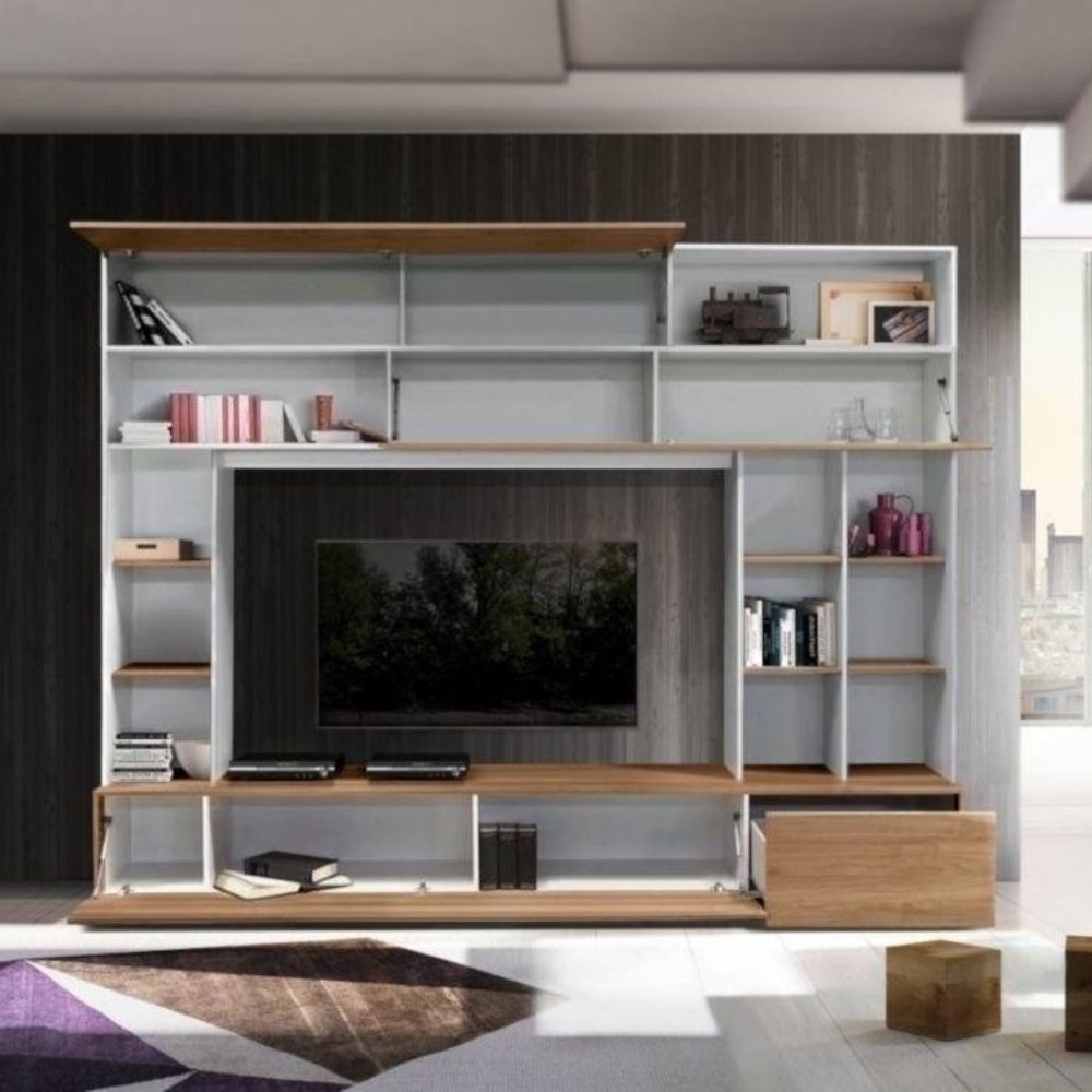 Parete attrezzata moderna in bianco e legno chiaro. Soluzione completa per organizzare casa con stile, perfetta per soggiorno e camera.