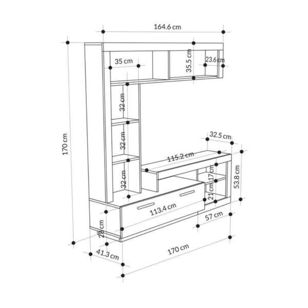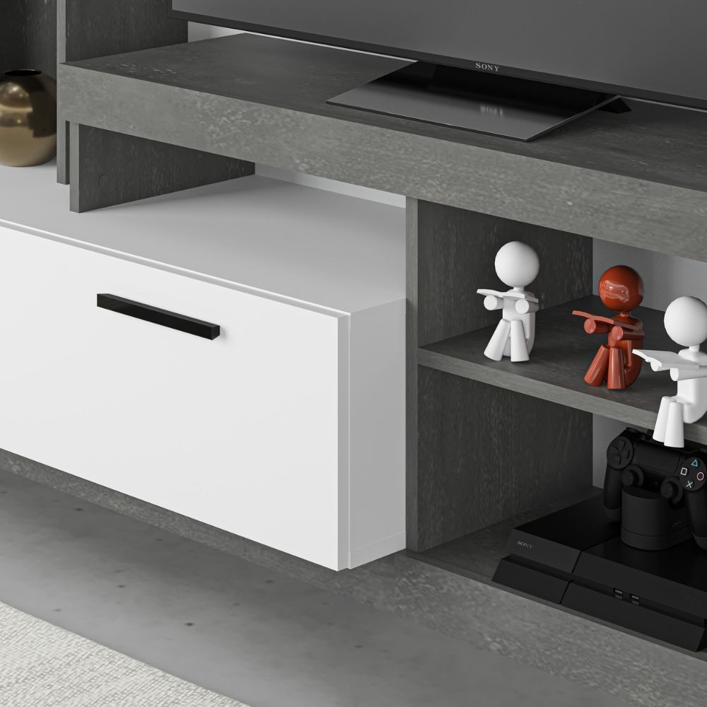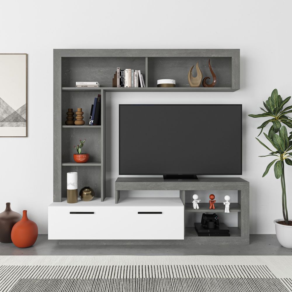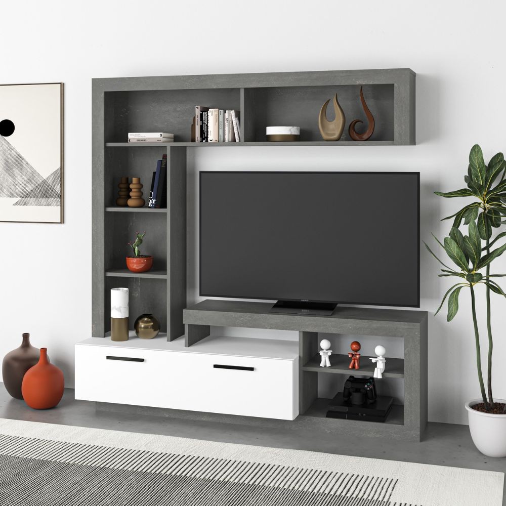 Parete attrezzata in stile moderno con vani aperti e sportello, perfetta per organizzare il soggiorno e posizionare il televisore con ele...