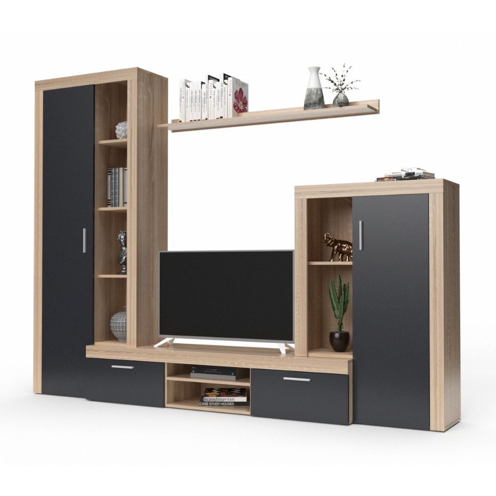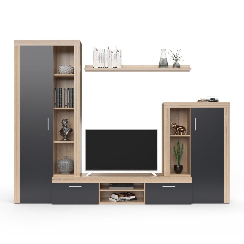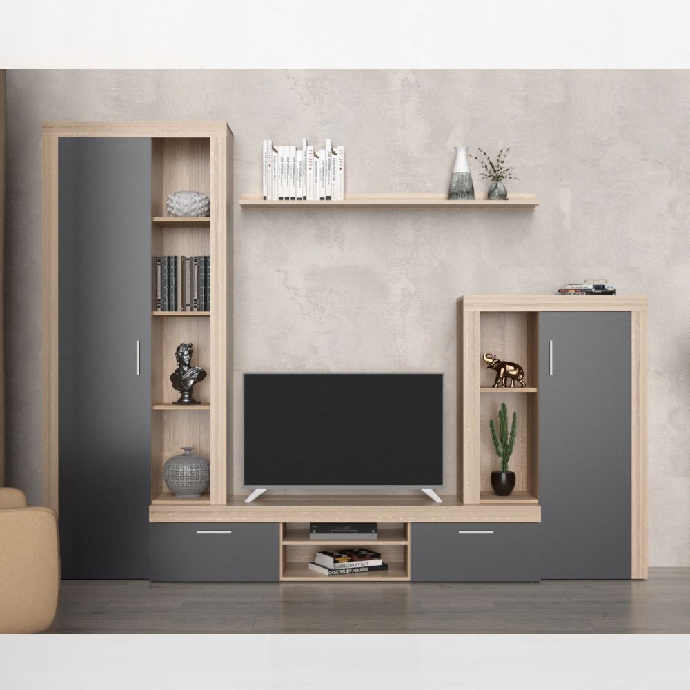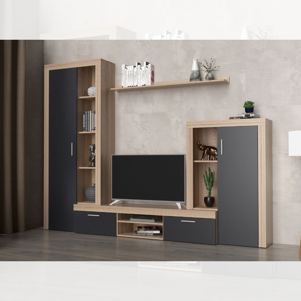 Parete attrezzata in rovere sonoma e grafite con libreria, ripiani e cassetti per organizzare casa con stile e funzionalità.