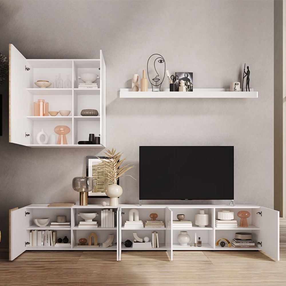 Parete attrezzata moderna in bianco e rovere, ideale per organizzare soggiorno e tv. Offre ampi spazi di archiviazione con sportelli e va...
