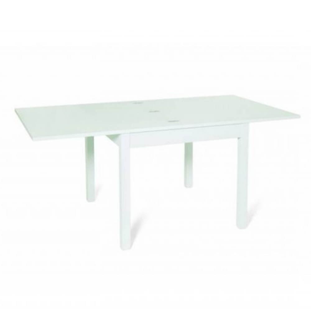 Tavolo allungabile bianco in legno, perfetto per piccoli spazi. Si apre facilmente a libro per ospitare più ospiti. Robusto e versatile p...