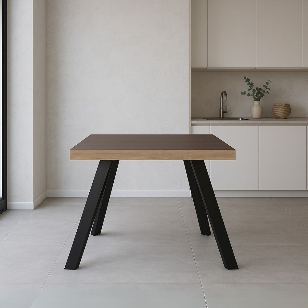 Tavolo quadrato con piano teak e gambe acciaio antracite. Elegante e resistente, perfetto per cucina e sala da pranzo. Design moderno che...