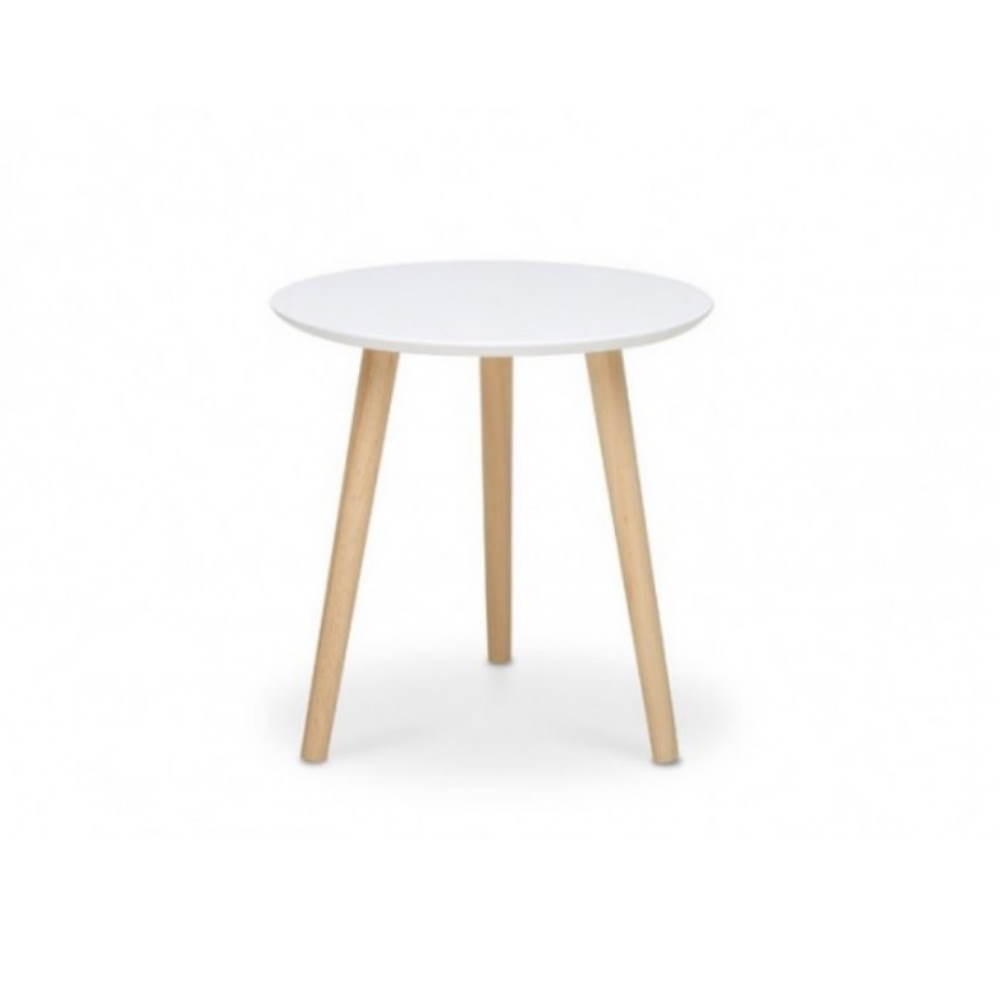 Tavolino rotondo in legno naturale con piano bianco. Perfetto per salotti piccoli, pratico e versatile in qualsiasi stanza della casa.