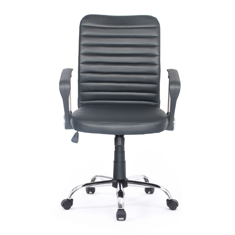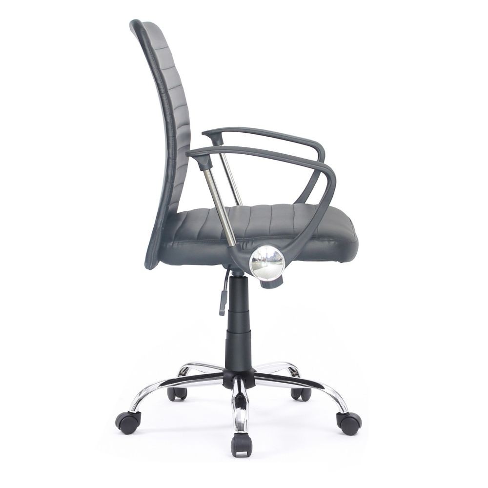 Poltrona da ufficio in pelle sintetica nera con base cromata e ruote girevoli. Seduta regolabile e braccioli per il massimo comfort duran...