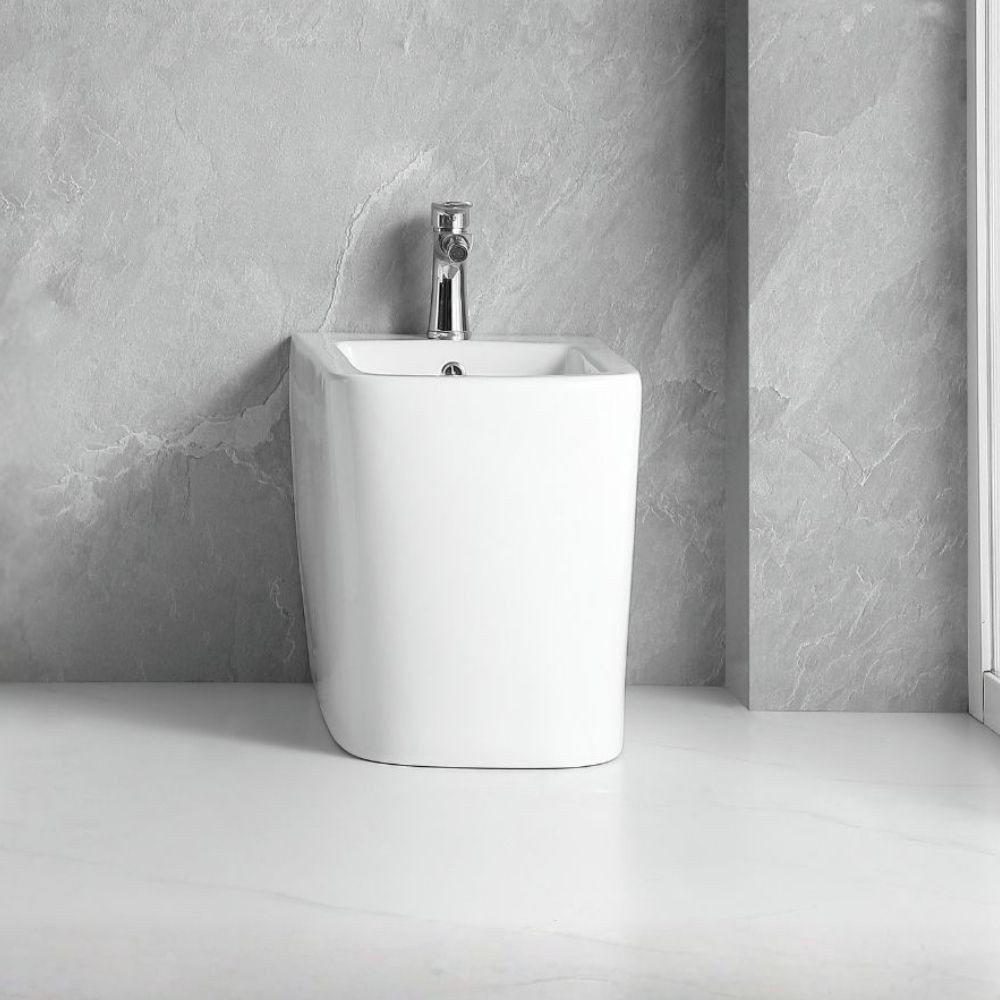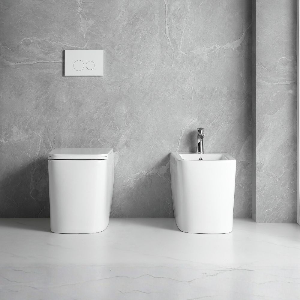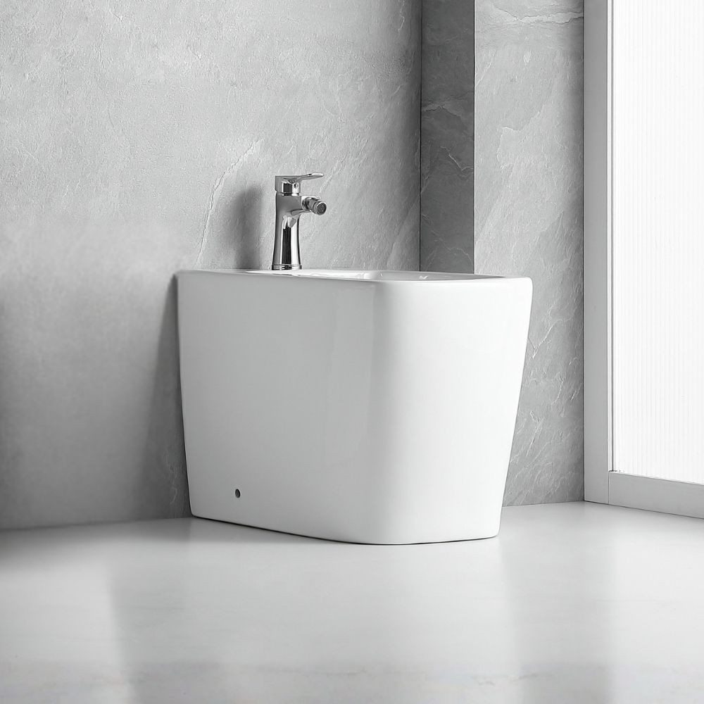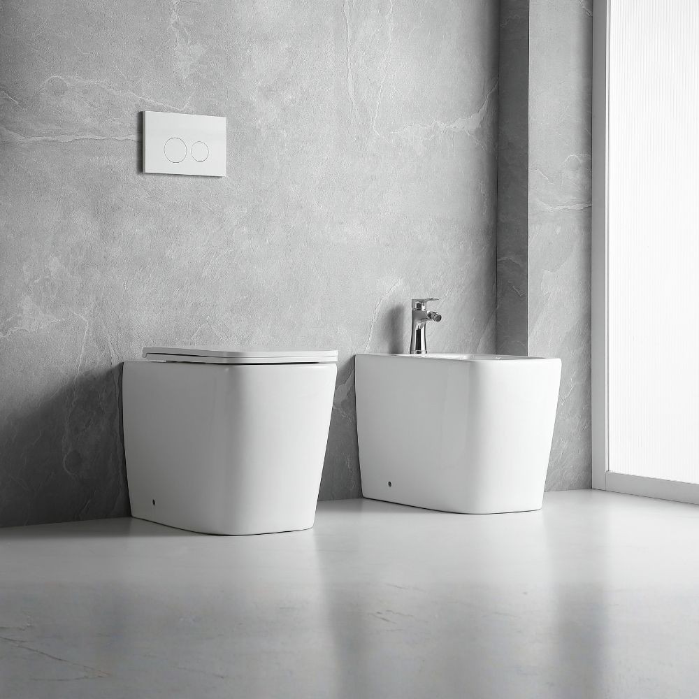 Bidet in ceramica bianca con design moderno e linee pulite, perfetto per bagni contemporanei con installazione a filo muro per un look or...
