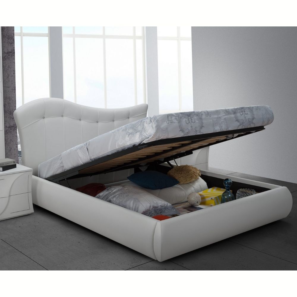 Letto matrimoniale imbottito con contenitore e testiera imbottita.