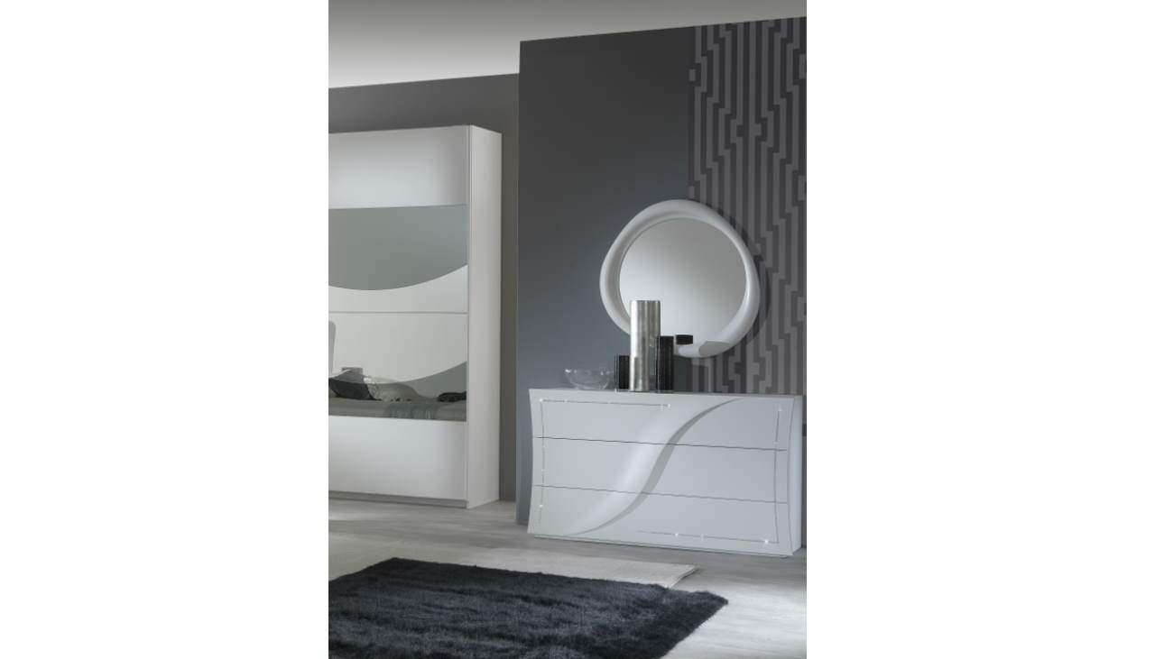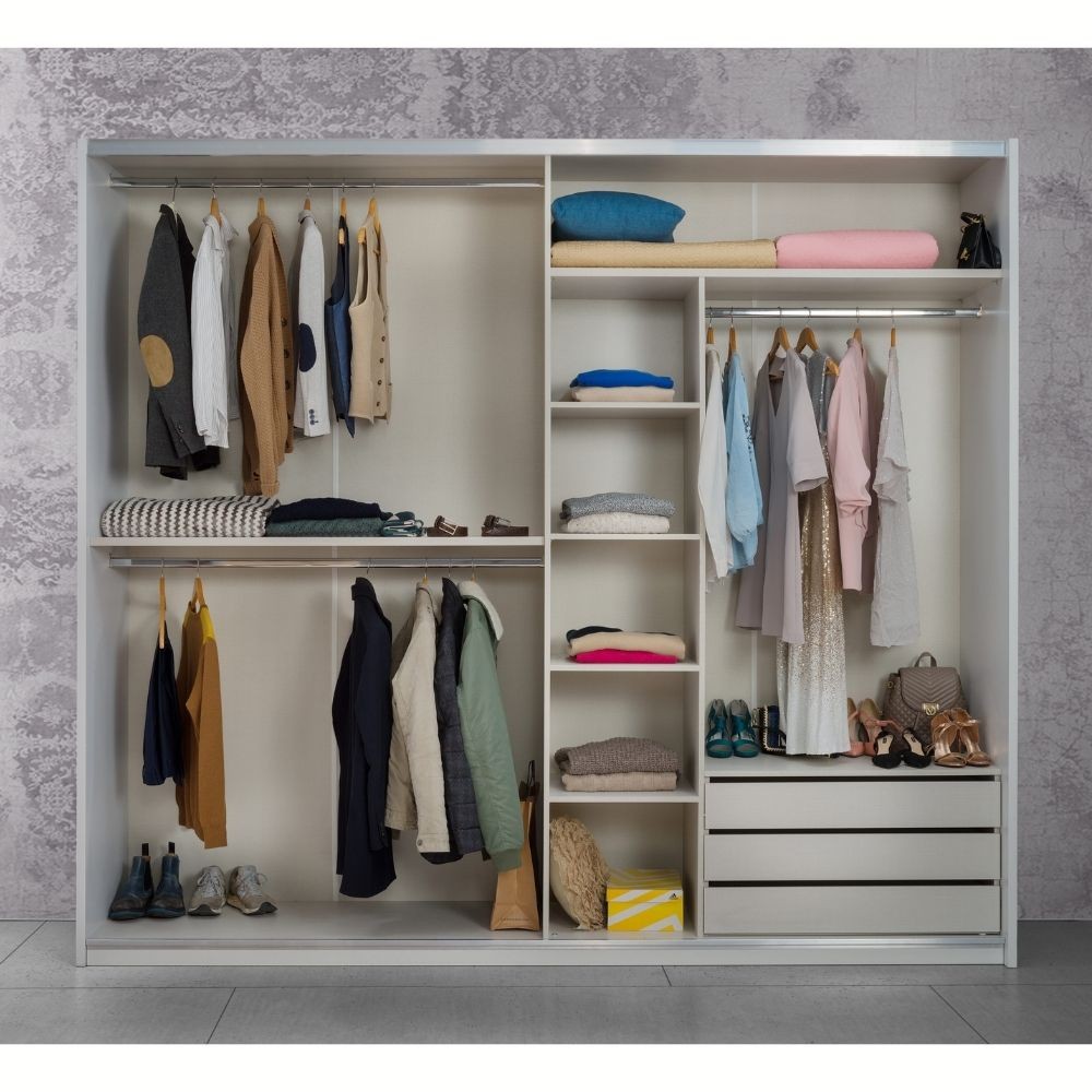 Armadio 2 ante scorrevoli con specchi. Spessore fianchi e ripiani 25 mm. Base, cappello e tramezzi spessore 18 mm.Dotato di piedini regolabili ammortizzatori, barra di rinforzo. Cassettiera interna inclusa.