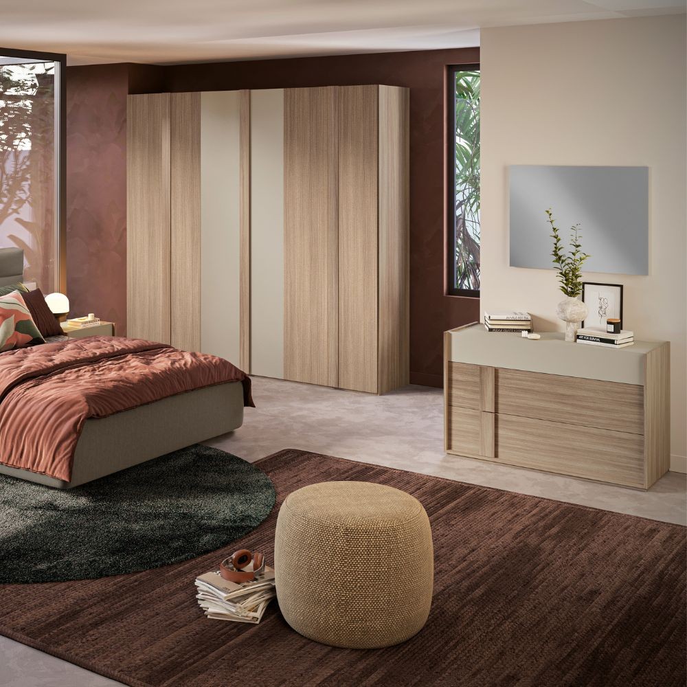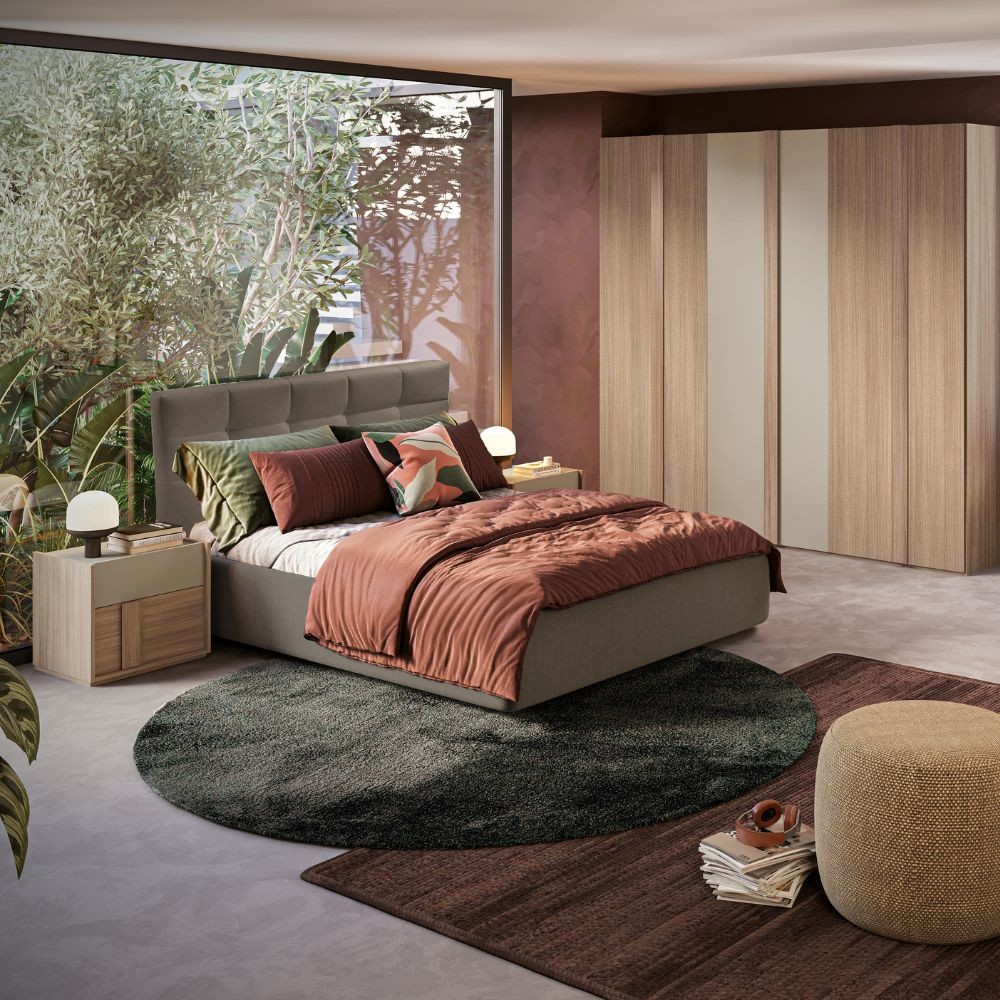 Camera da letto Faba con armadio 6 ante battenti noce e talco e letto contenitore imbottito Napoli tortora