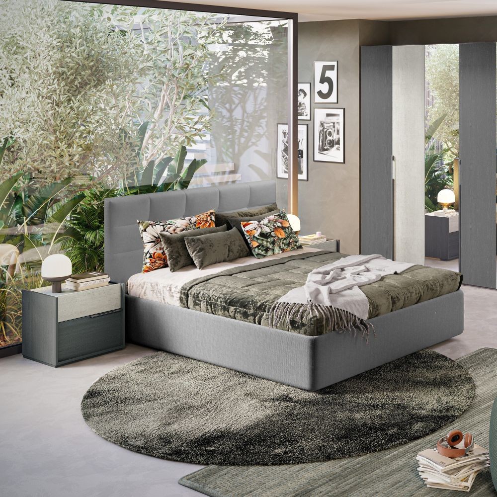 Camera da letto Faba in grigio e cemento con armadio 6 ante battenti a specchio e letto contenitore Ascoli grigio