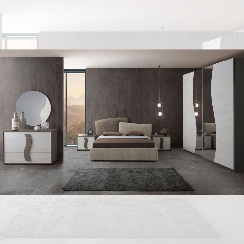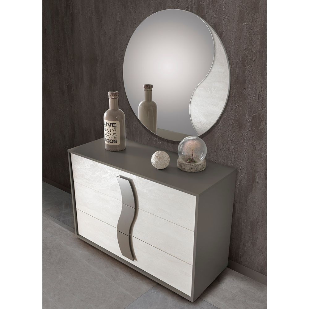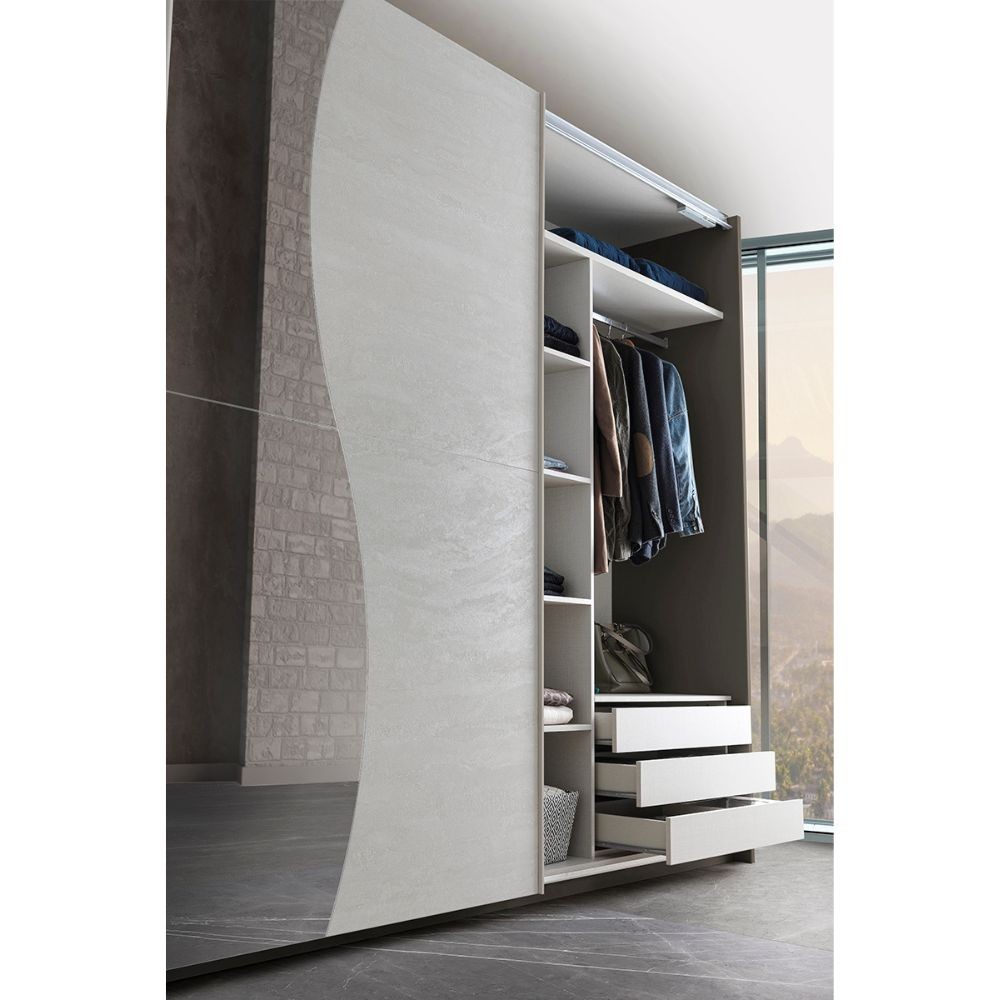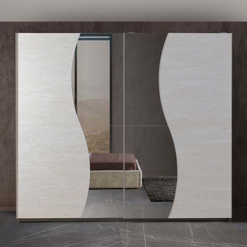 Armadio 2 ante scorrevoli con specchio dalle linee sinuose. Fianchi spessore 25 mm e pannello da 18 mm.