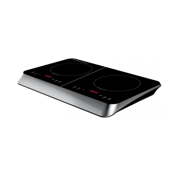 Fornello a induzione, consente di cuocere i cibi riducendo sensibilmente i tempi di cottura, con notevole risparmio energetico (circa 30%). La corrente indotta riscalda solo la superfi¬cie del piano cottura direttamente a contatto con la pentola, evitando qualsiasi rischio di scottatura. Pannello di controllo digitale touch con display. Facile da pulire. Timer di autospegnimento. 2 zone di cottura con potenza differenziata: a sinistra 2000W, a destra 1500W. Per il funzionamento del fornello ad induzione é necessario utilizzare pentole con fondo magnetico.