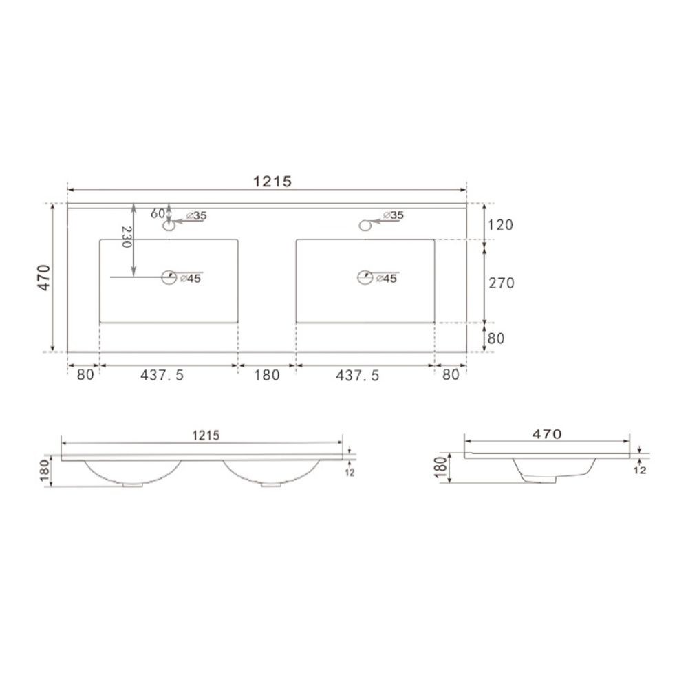 Dimensioni lavabo: L 121.5 x P 47 x H 18 cm.