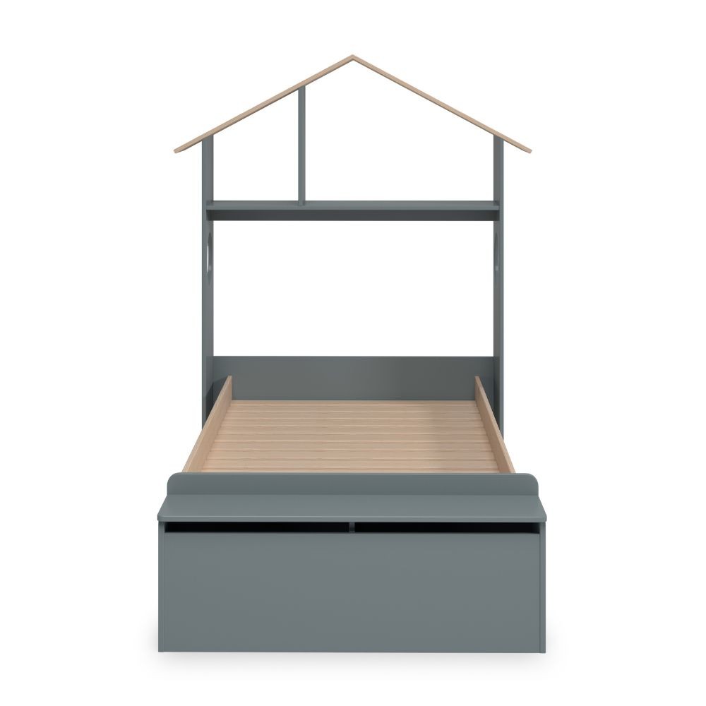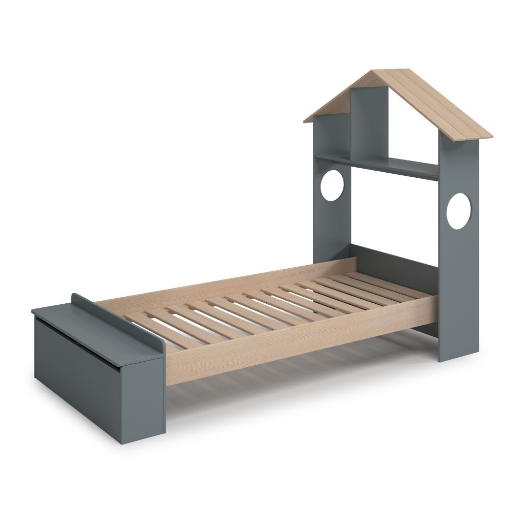 Letto singolo Odessa con testiera casetta e pediera contenitore in legno massiccio colore verde cachi e pino