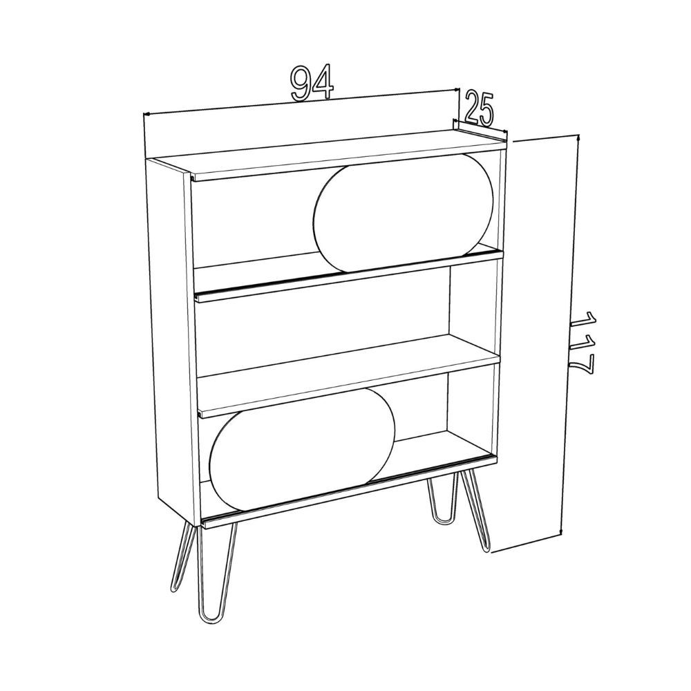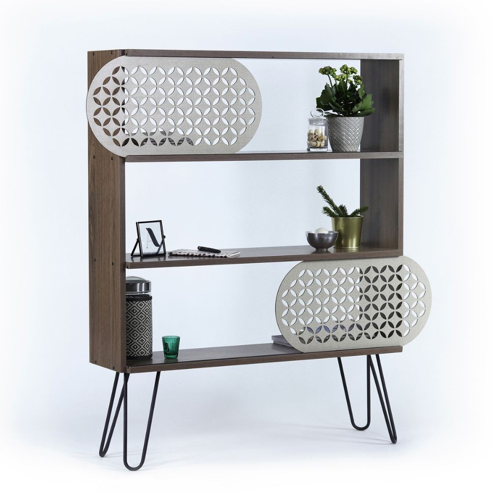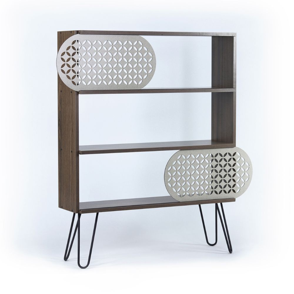 Assoluto elemento di design. Libreria composta da piedi in metallo di colore nero e struttura di colore noce. 3 ripiani, di cui primo e ultimo caratterizzati da un binario dove scorrono due griglie forate color crema. Questo particolare, rende la libreria davvero originale.