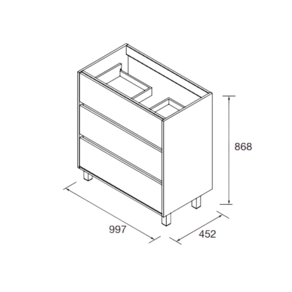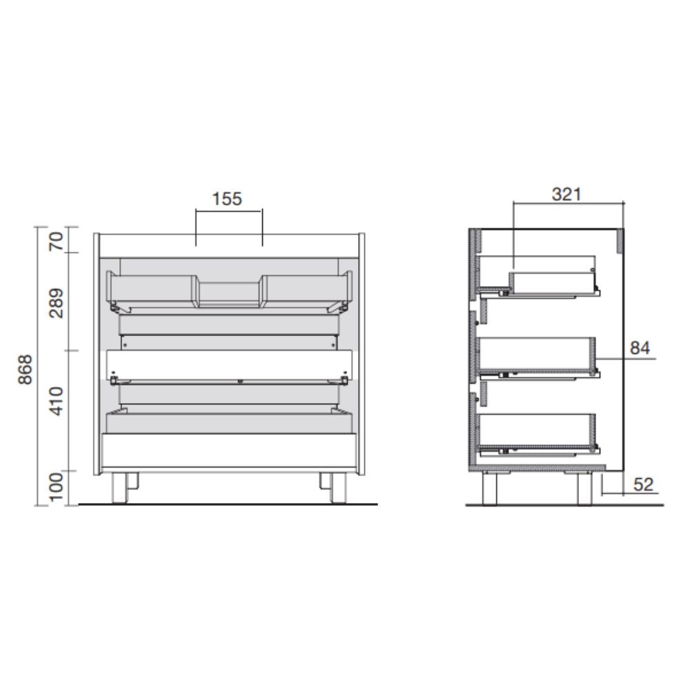 3 cassetti portata max 20 kg ciascuno con chiusura ammortizzata.