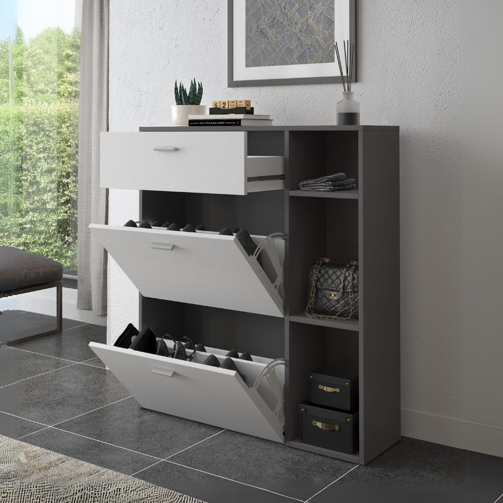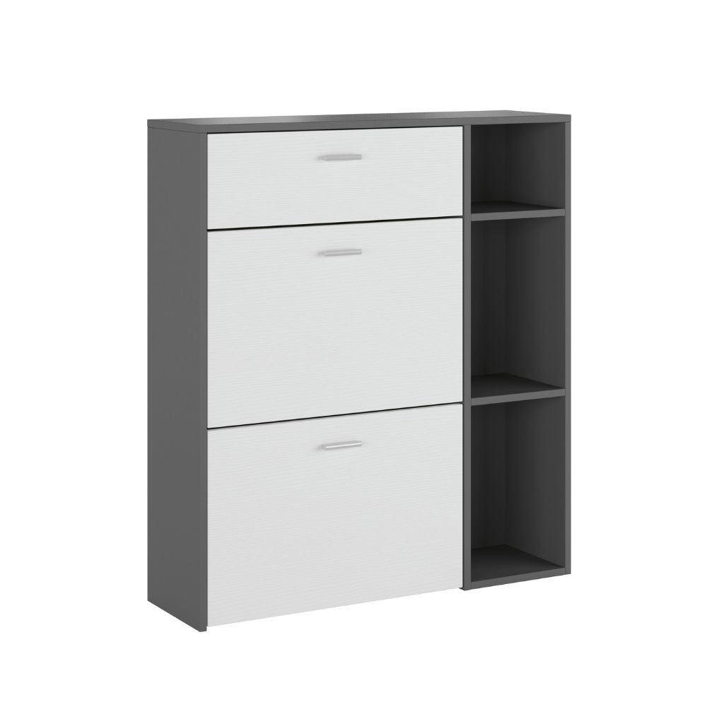 Scarpiera Takimi con 2 ante a ribalta 1 cassetto colore grafite e bianco
