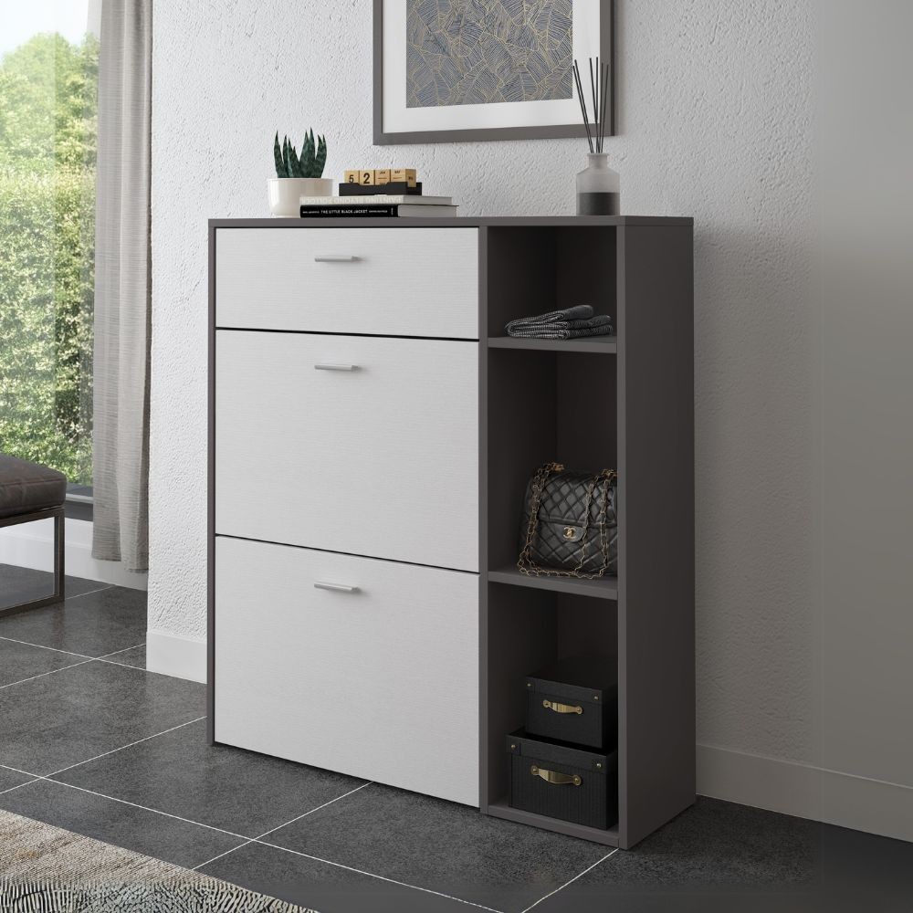 Scarpiera Takimi con 2 ante a ribalta 1 cassetto colore grafite e biancoScarpiera Takimi con 2 ante a ribalta 1 cassetto colore grafite e bianco