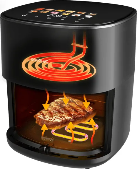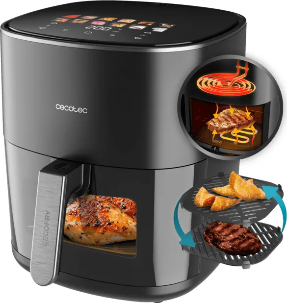 Cecotec Cecofry&Grill Duoheat 6500. Tipo di prodotto: Friggitrice ad aria calda, Capacità: 6,5 L, Temperatura (min): 40 °C. Tipo di costruzione: Singolo, Colore del prodotto: Nero, Tipo di controllo: Touch. Tipo di display: LCD. Potenza: 2200 W