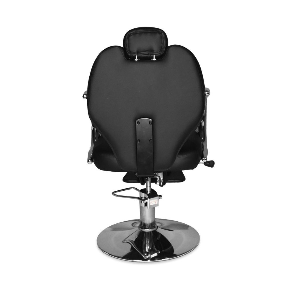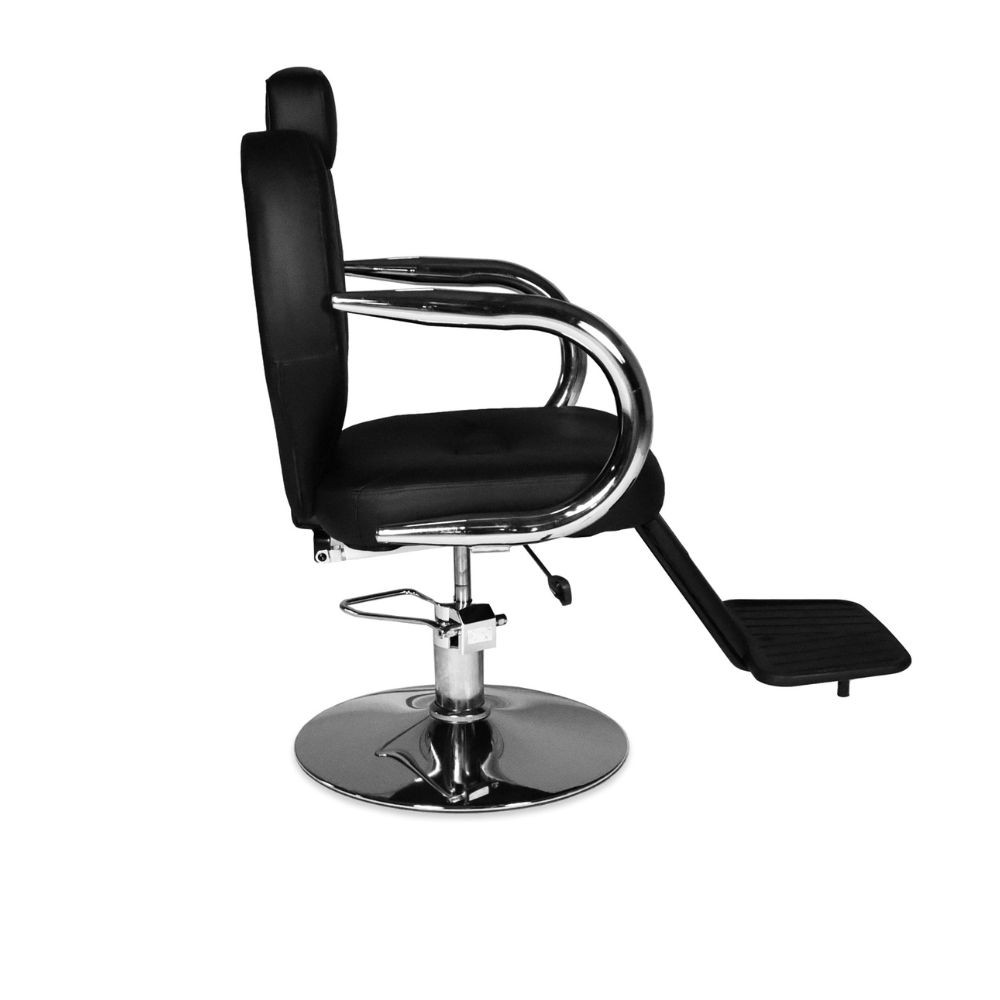 Poltrona da barbiere Bobo reclinabile in ecopelle nero con braccioli e struttura in acciaio cromato lucido