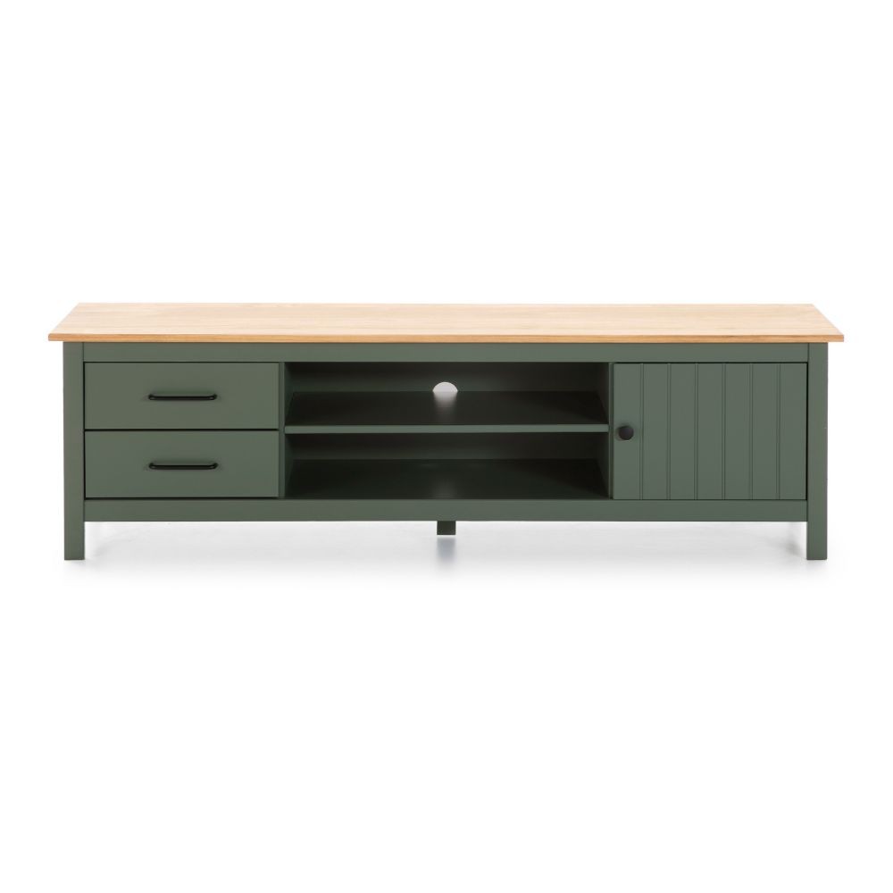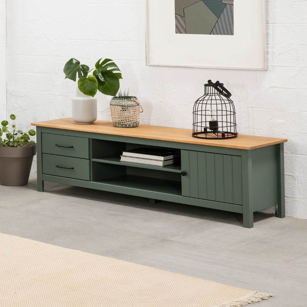 Mobile porta tv Miranda con 1 anta 2 cassetti e 2 vani a giorno in legno massiccio colore verde e top pino