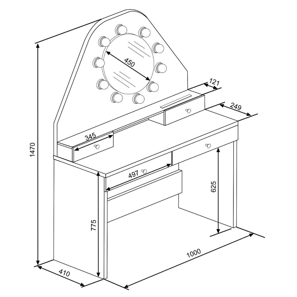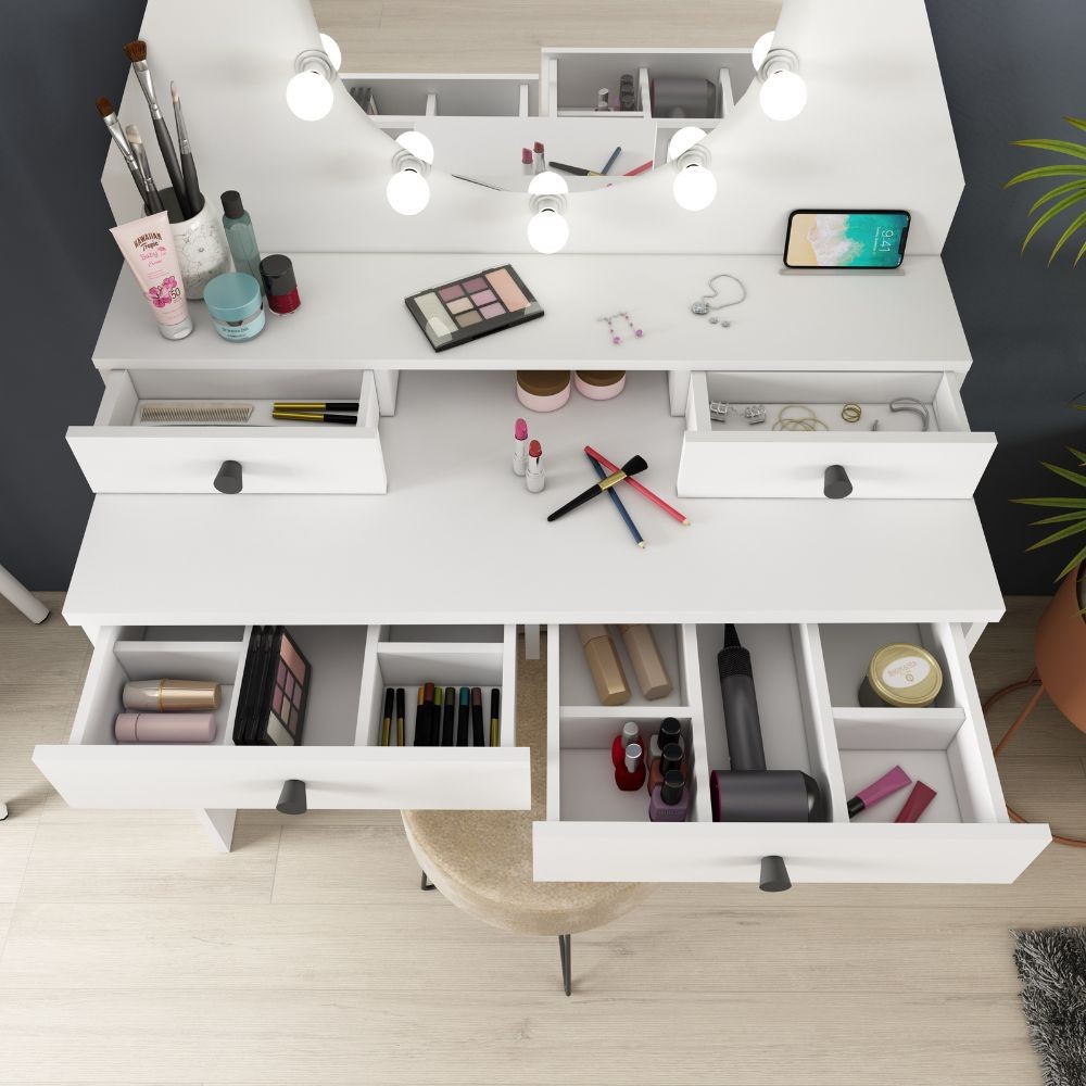 Toeletta da trucco con specchio a luci a led con doppio ripiano e 4 cassetti bianco