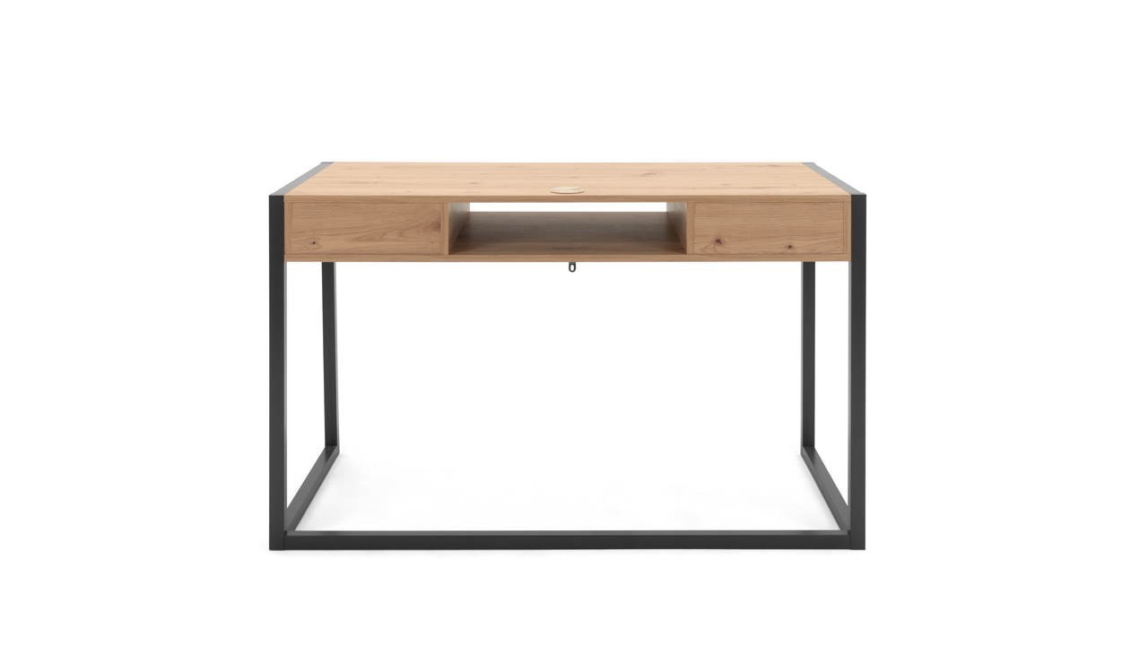 La scrivania Denver 30 è composta da 2 cassetti e un vano a giorno. La scocca e i cassetti sono in finitura quercia, mentre i profili e i particolari sono colore antracite.