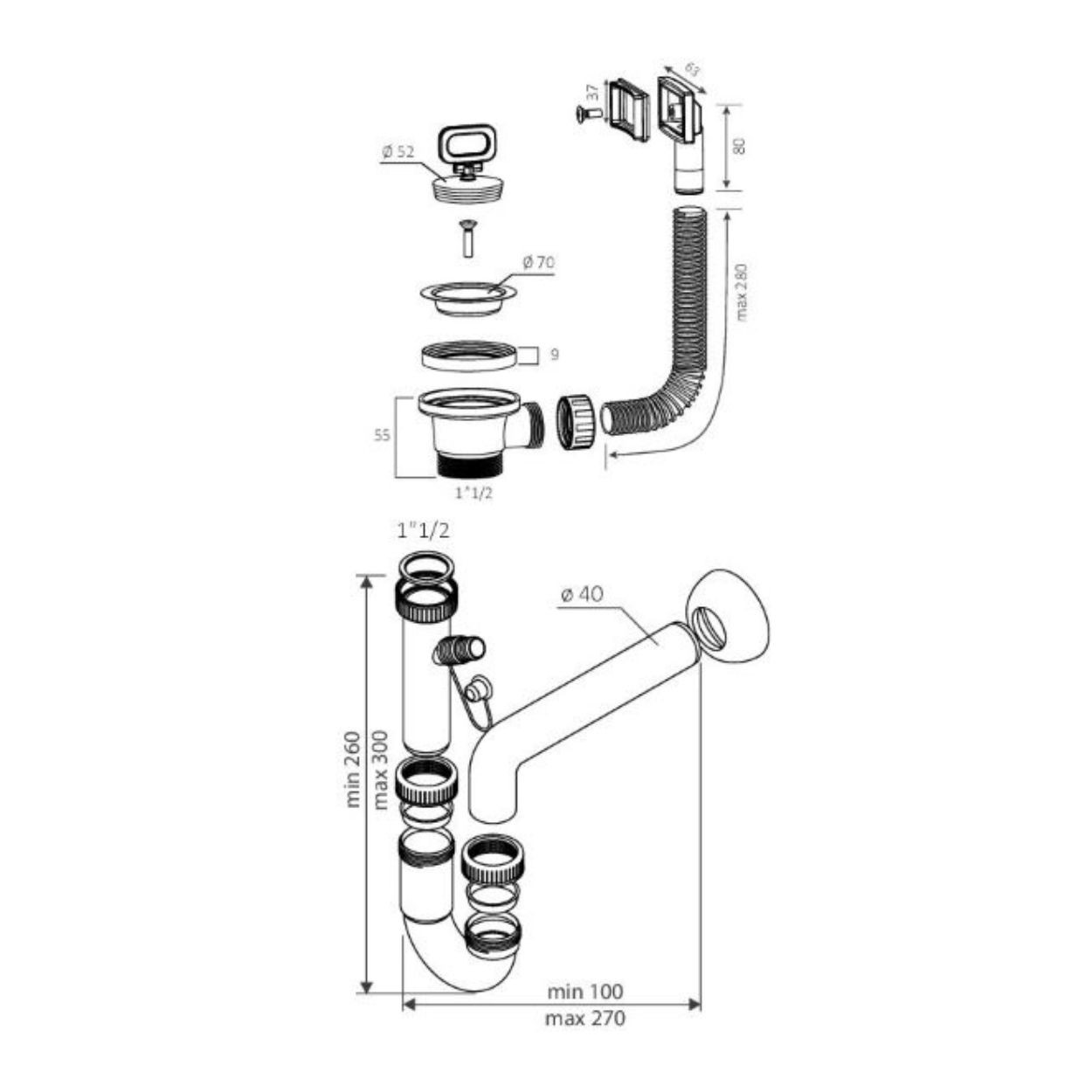 Sifone 1 via con attacco lavastoviglie e piletta 2''Sifone 1 via con attacco lavastoviglie e piletta 2”