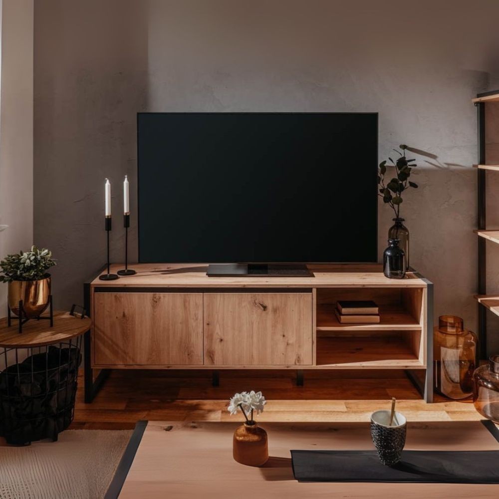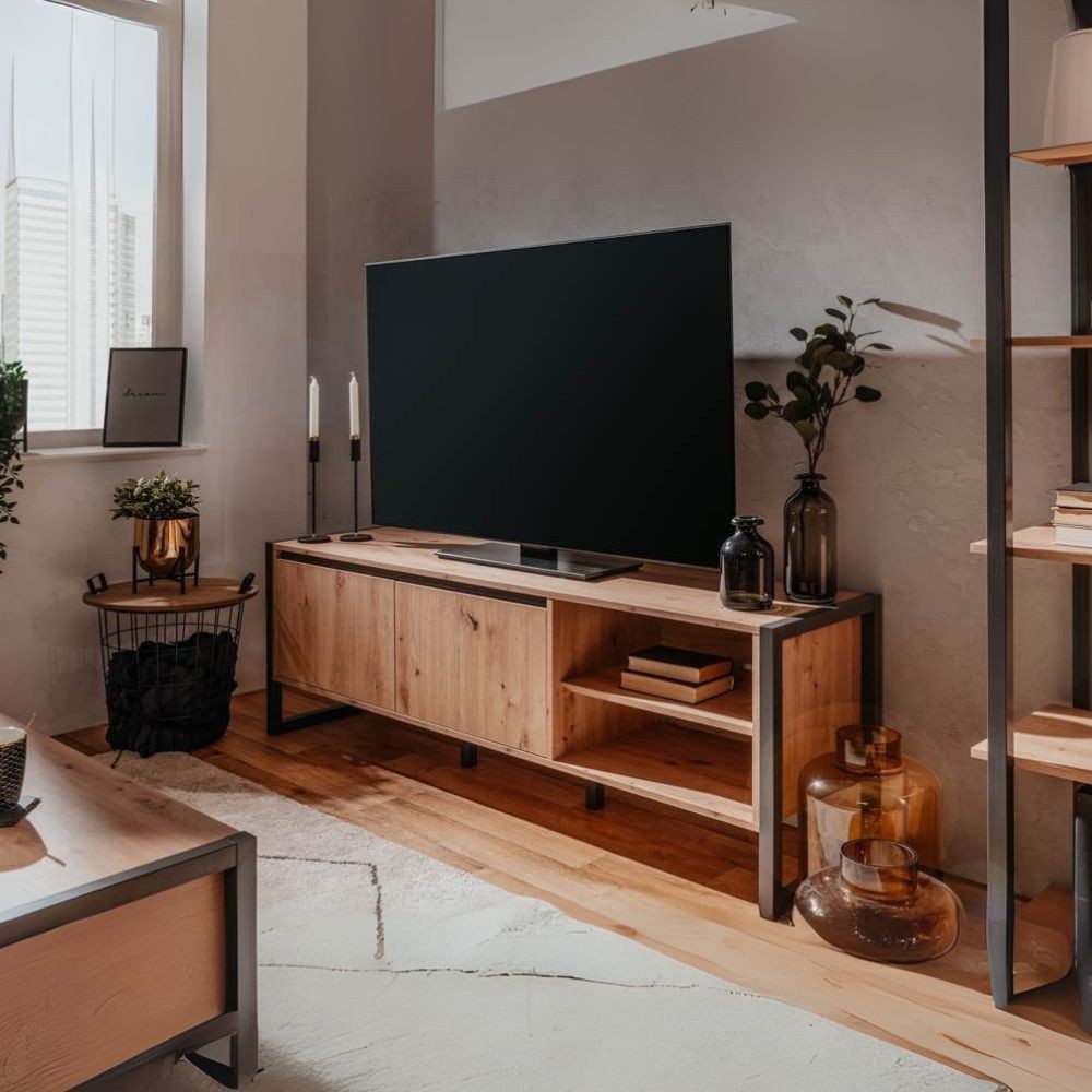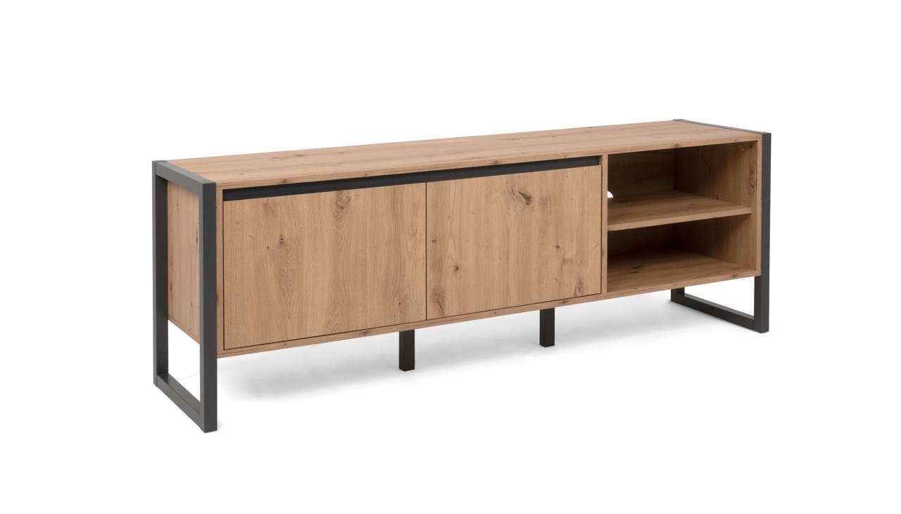 Il mobile porta TV Denver 54 è composto da 2 ante e 2 vani a giorno. La scocca, le ante e gli interni del mobile sono in finitura quercia, mentre i profili e i particolari sono colore antracite. All’interno del mobile troviamo un comodo ripiano. Foro passacavo presente sul retro del mobile.