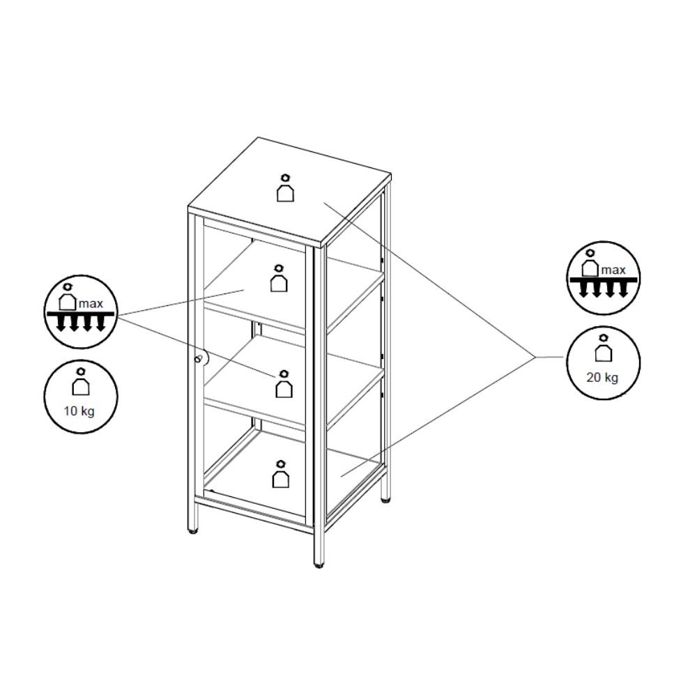 Portata massima ripiano superiore ed inferiore (vedi foto) 20 kg.